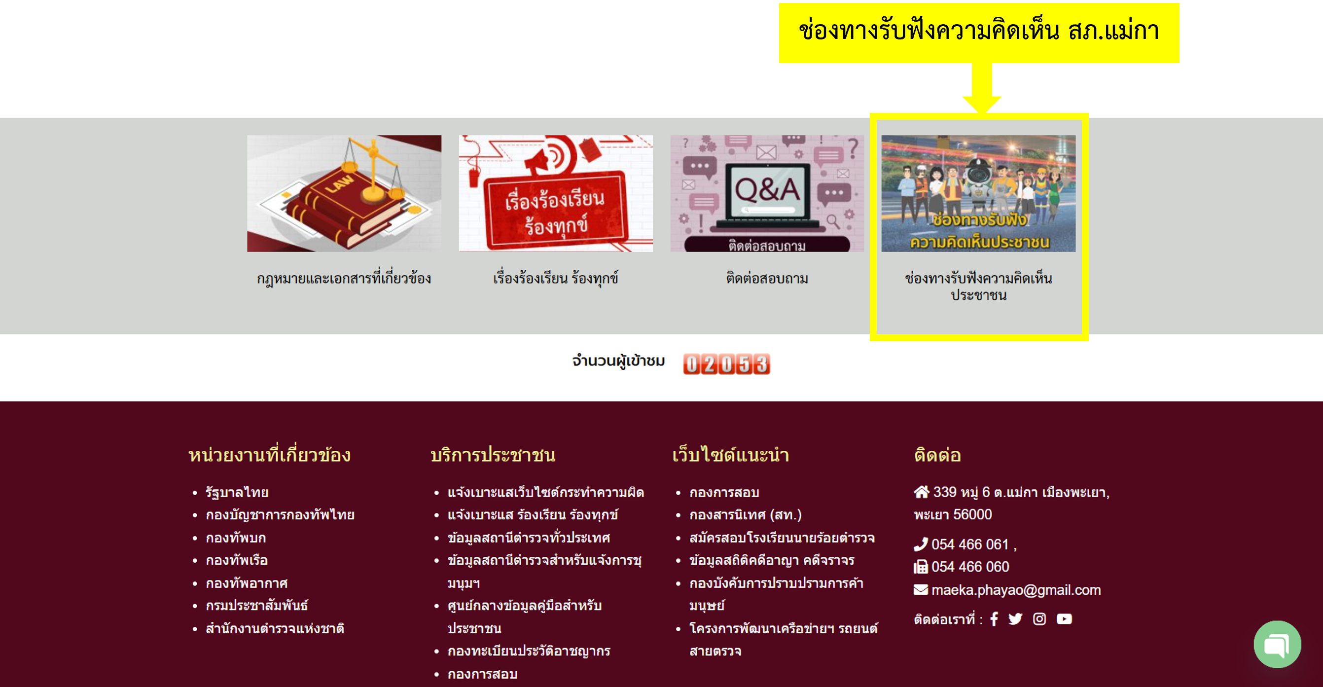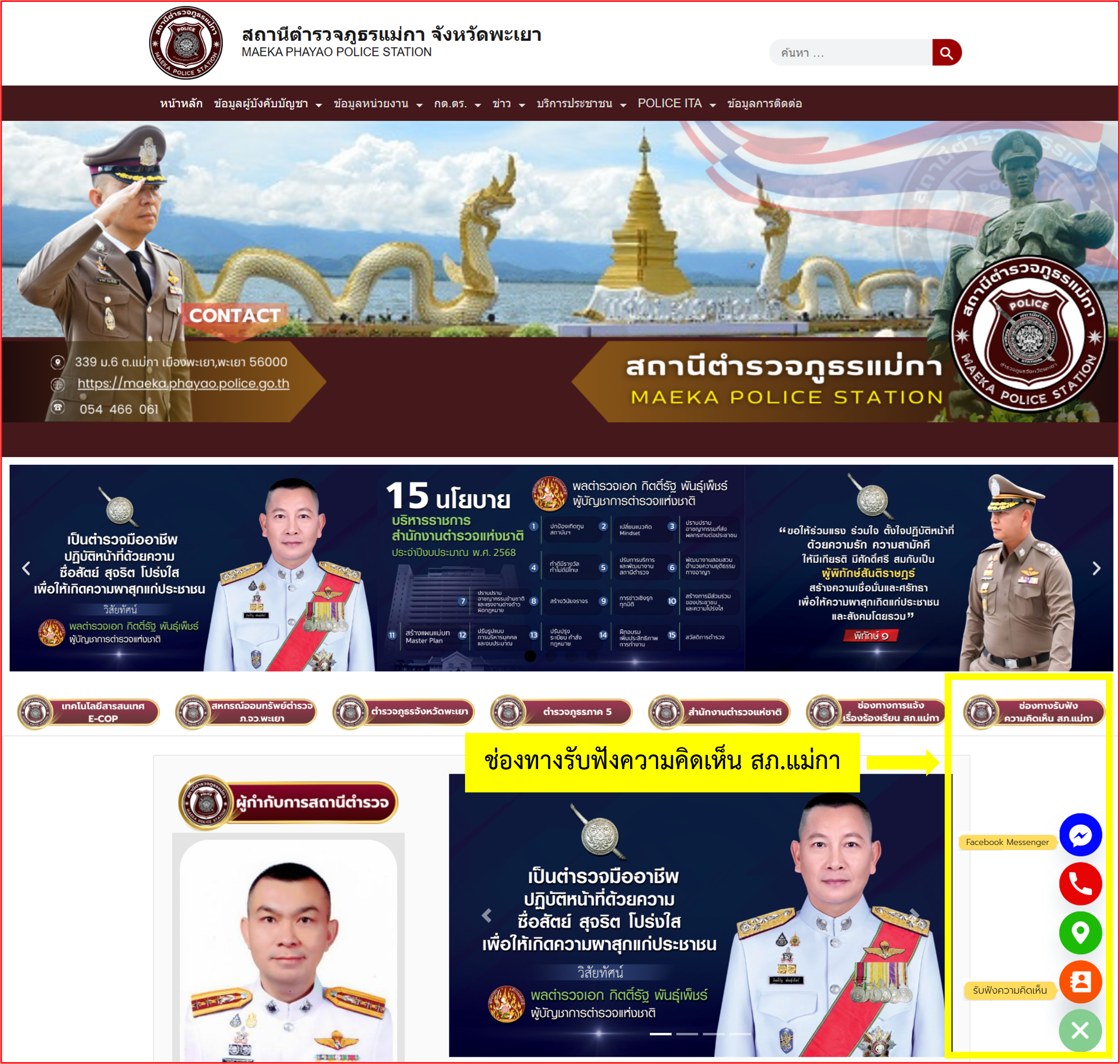 สถานีตำรวจภูธรแม่กา มีบริการช่องทางให้ประชาชนติดต่อ/ถาม-ตอบ/รับฟังความคิดเห็นของประชาชน โดยสามารถติดต่อผ่านช่องทาง Facebook Messenger แชท และช่องรับฟังความคิดเห็น ที่ปรากฎที่มุมด้านล่างขวามือของหน้าต่าง หรือแถบเมนูหน้า web site ตามรูปภาพด้านบน หรือสามารถส่งความคิดเห็นผ่านทาง Link ที่ให้ไว้ที่หน้า web site สภ.แม่กา : https://maeka.phayao.police.go.th ตามภาพด้านล่าง